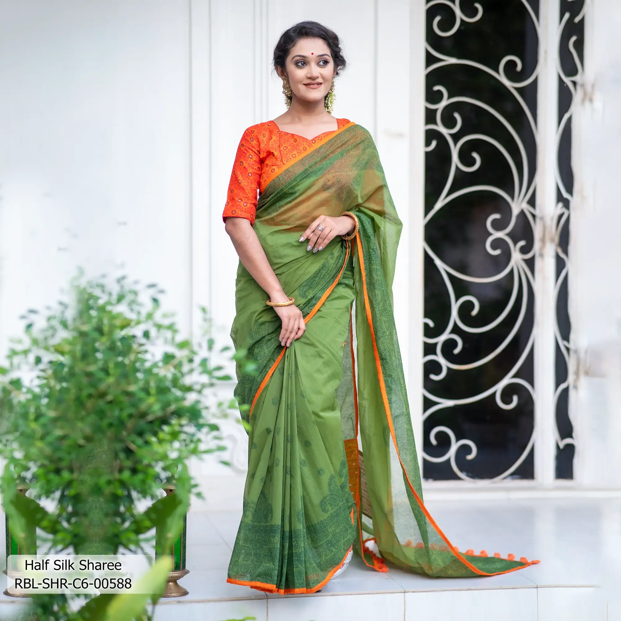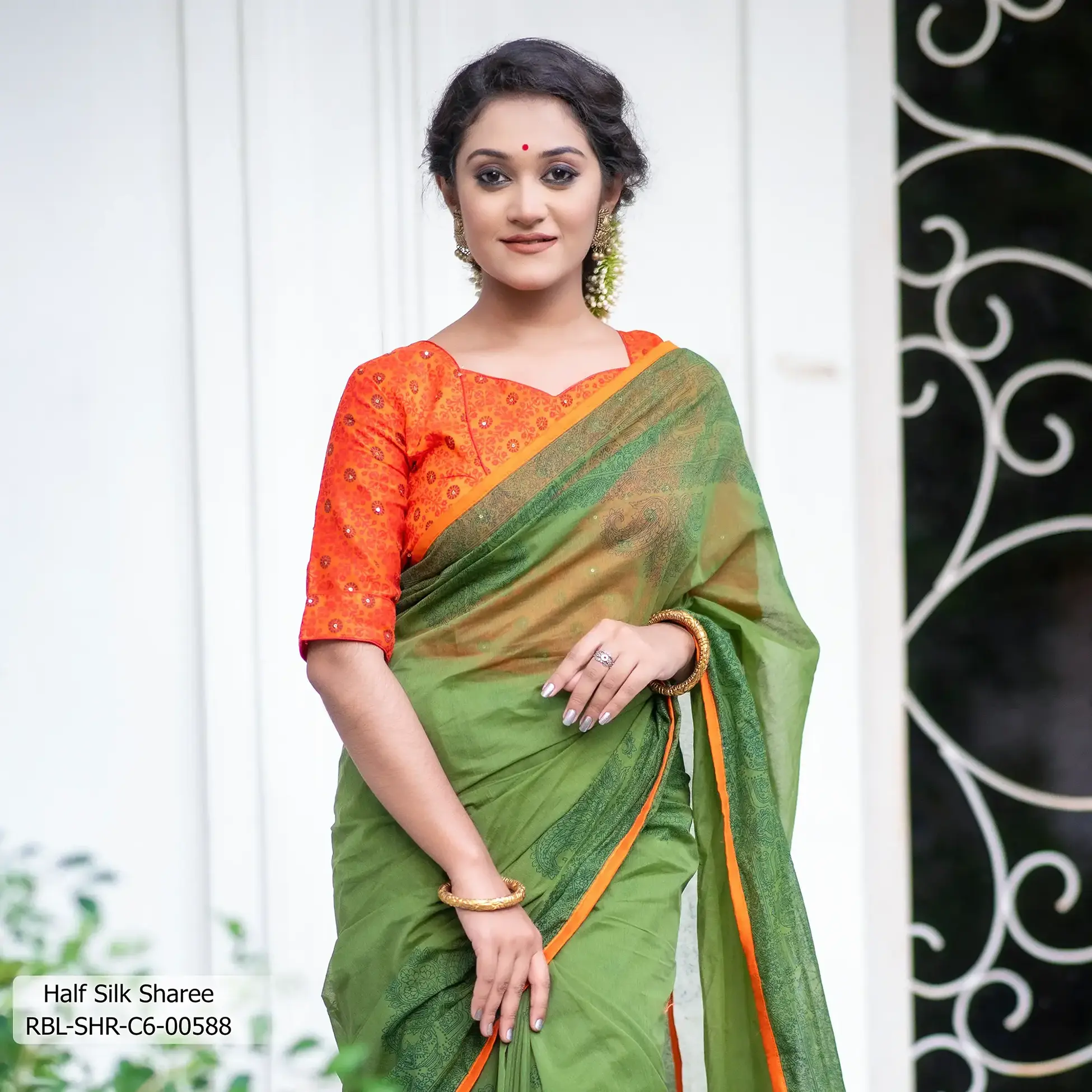 • Product Details: This half-silk sharee features screen-print, patchwork & handwork.