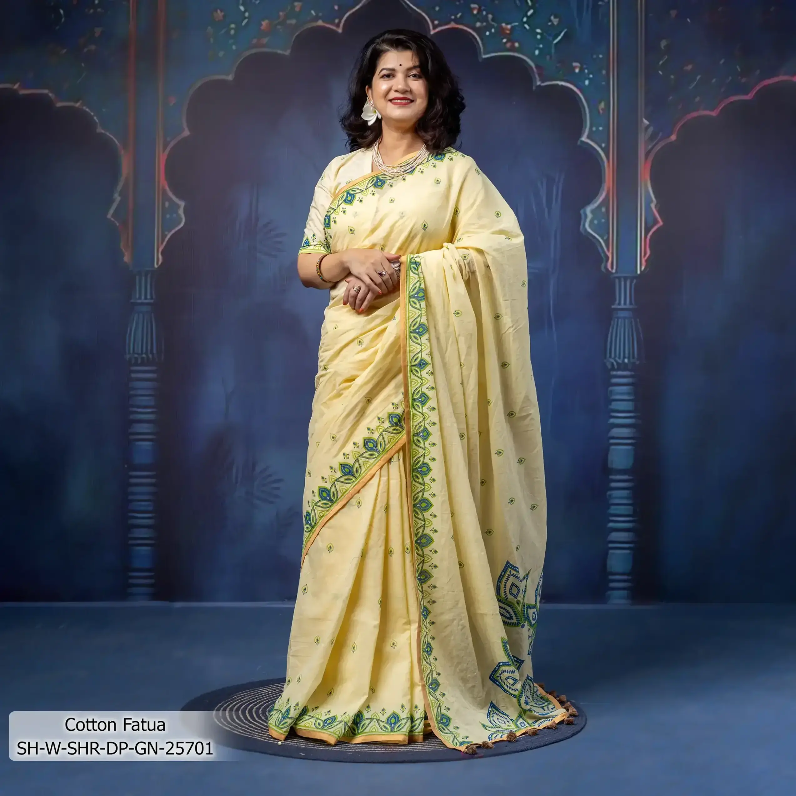 • Product Details: This Sulb-Cotton sharee feature Screen-Print , Patch-Work & Hand-Work .