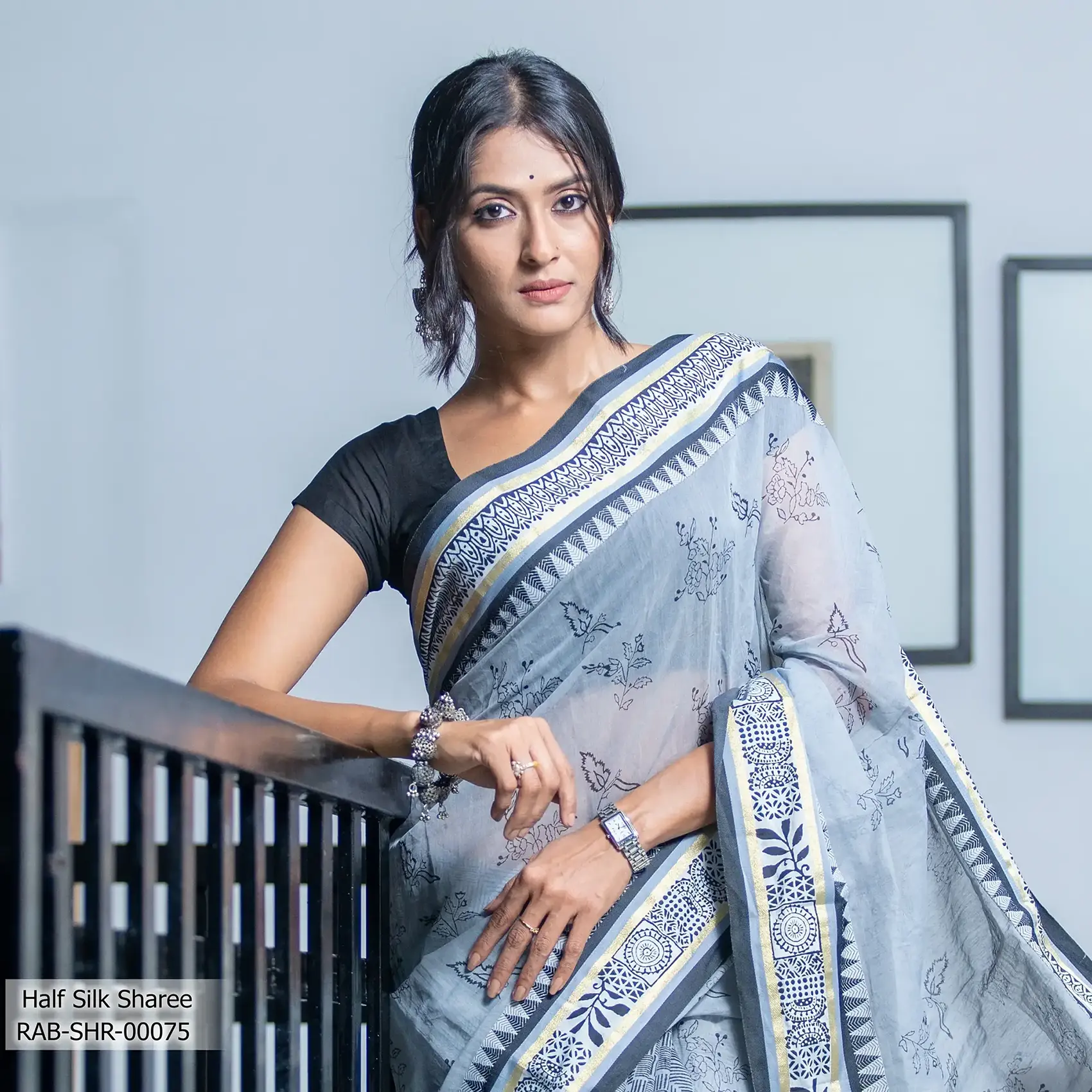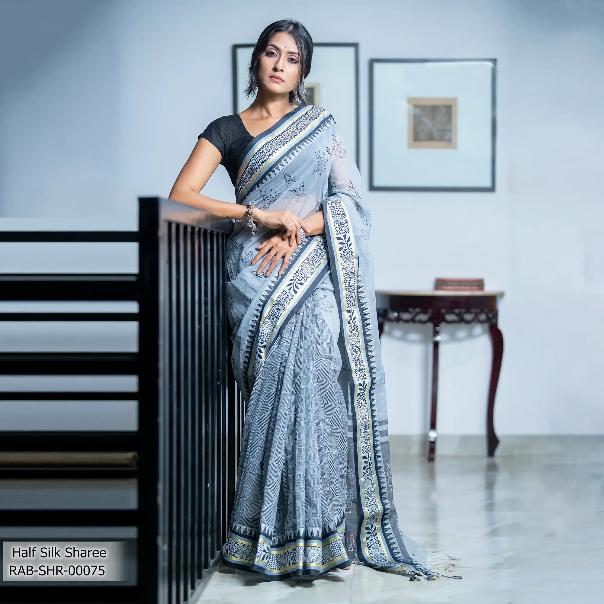 • Product Details: This half silk sharee features block-print & embroidery work.