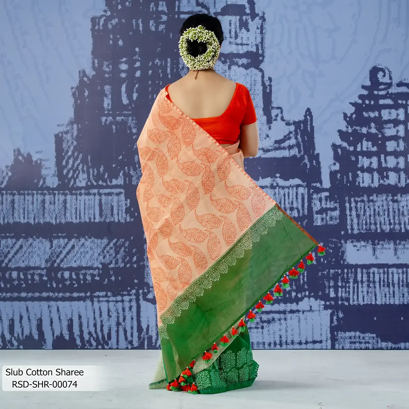- Product Details: This slub-cotton women’s sharee features block-print & handwork.