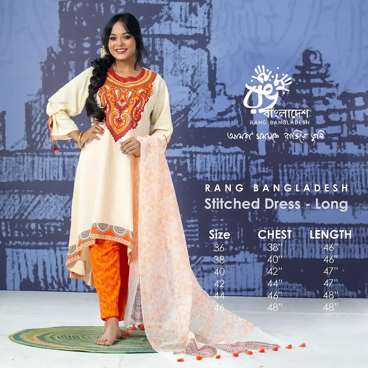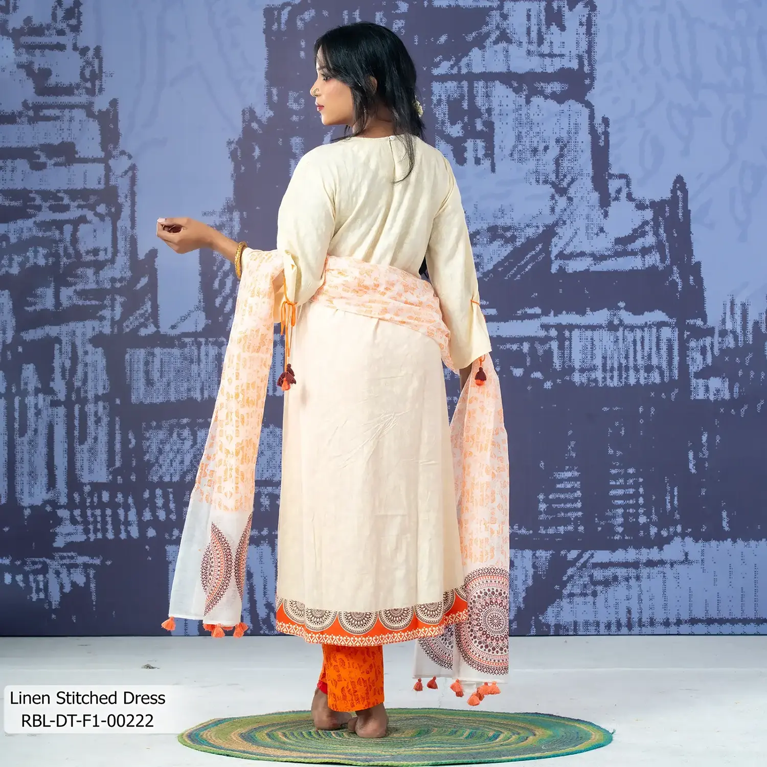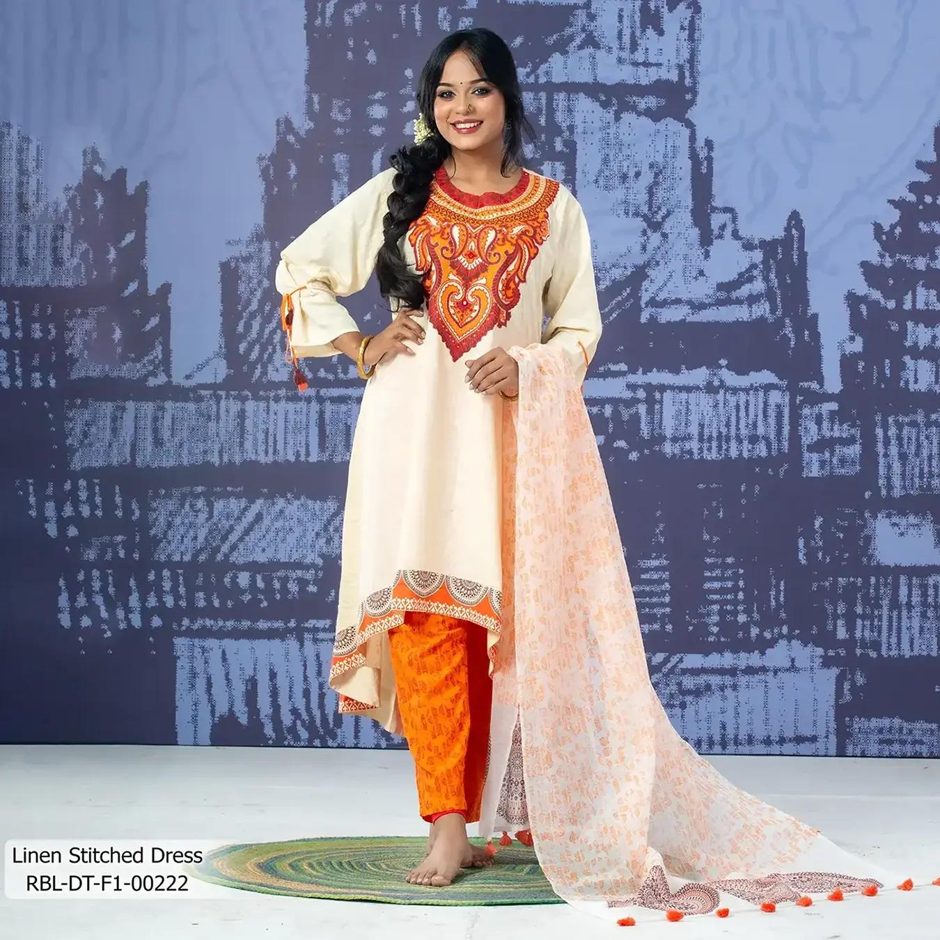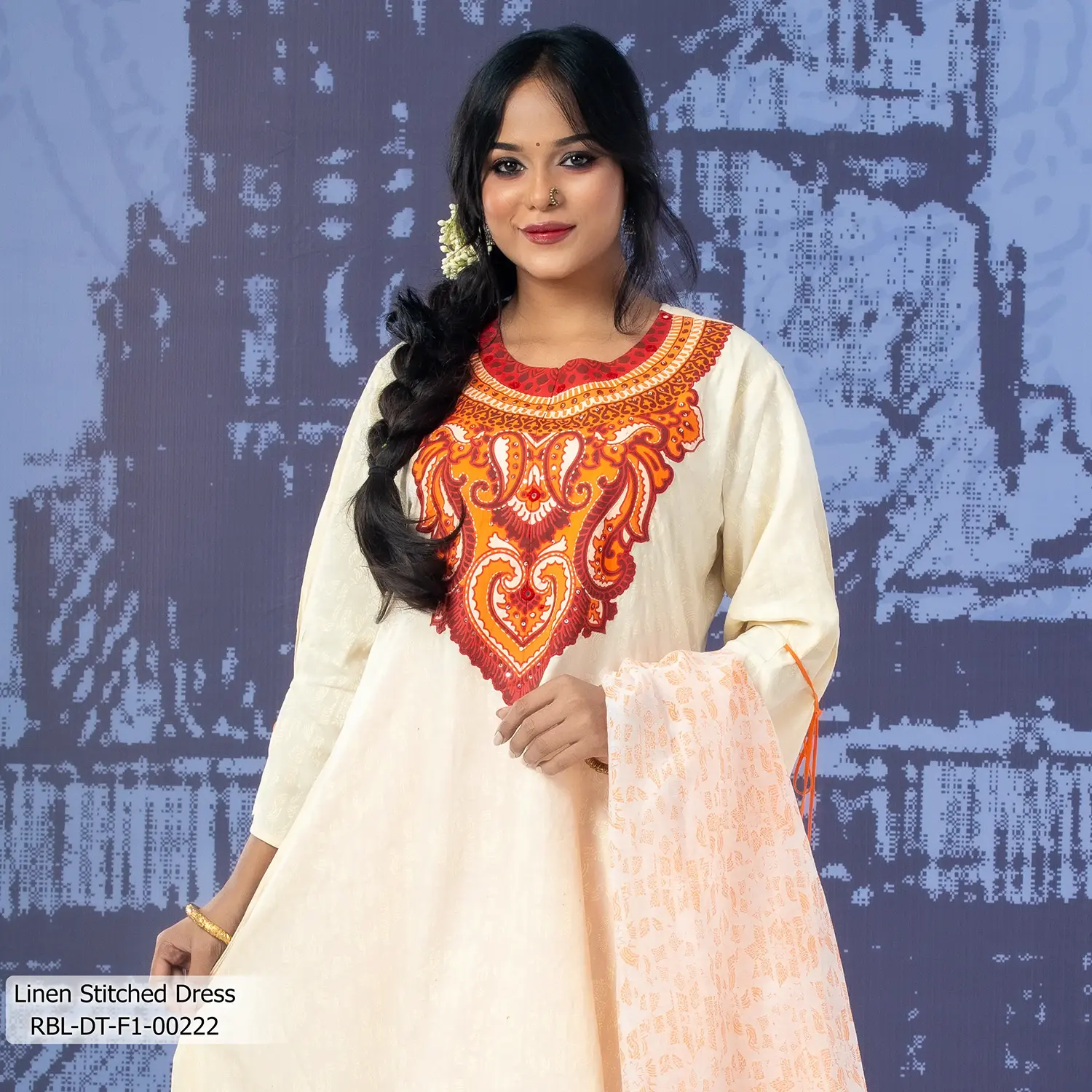 - Product Details: This linen women’s stitched dress features screen-print, patchwork & handwork.