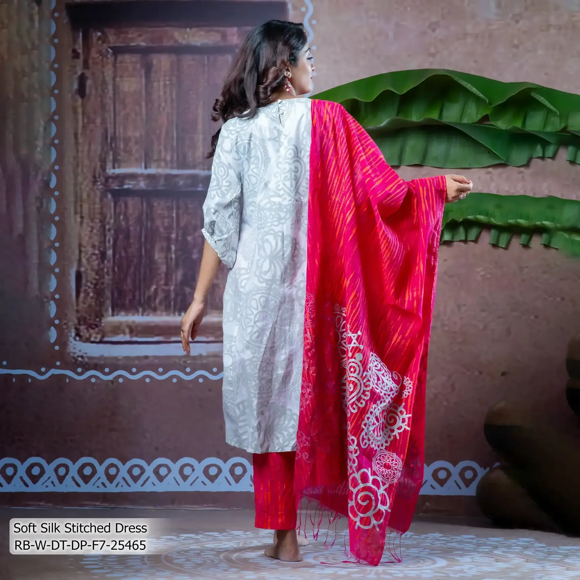 - Product Details: This Soft-Silk women’s stitched dress features screen-print & Embroidery.