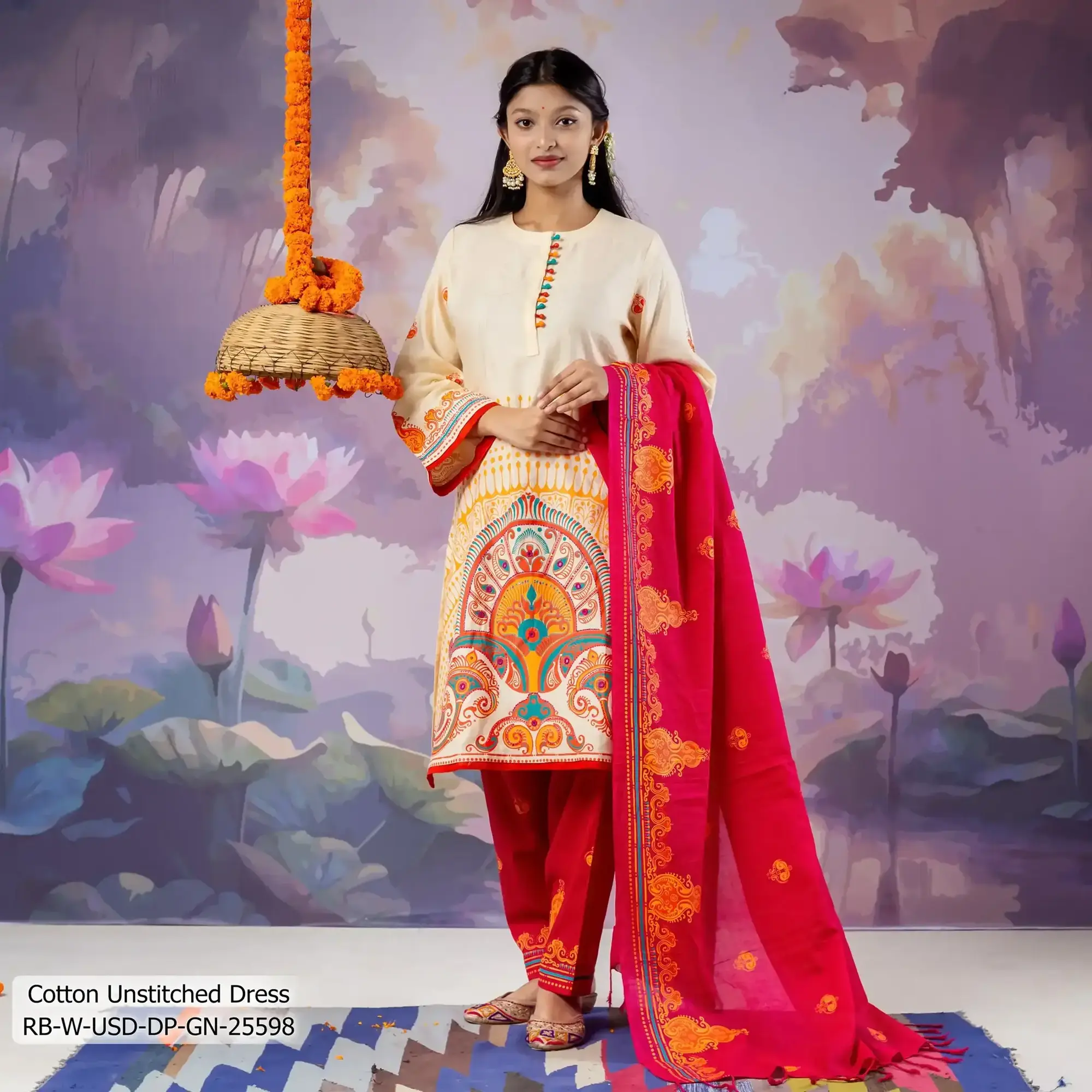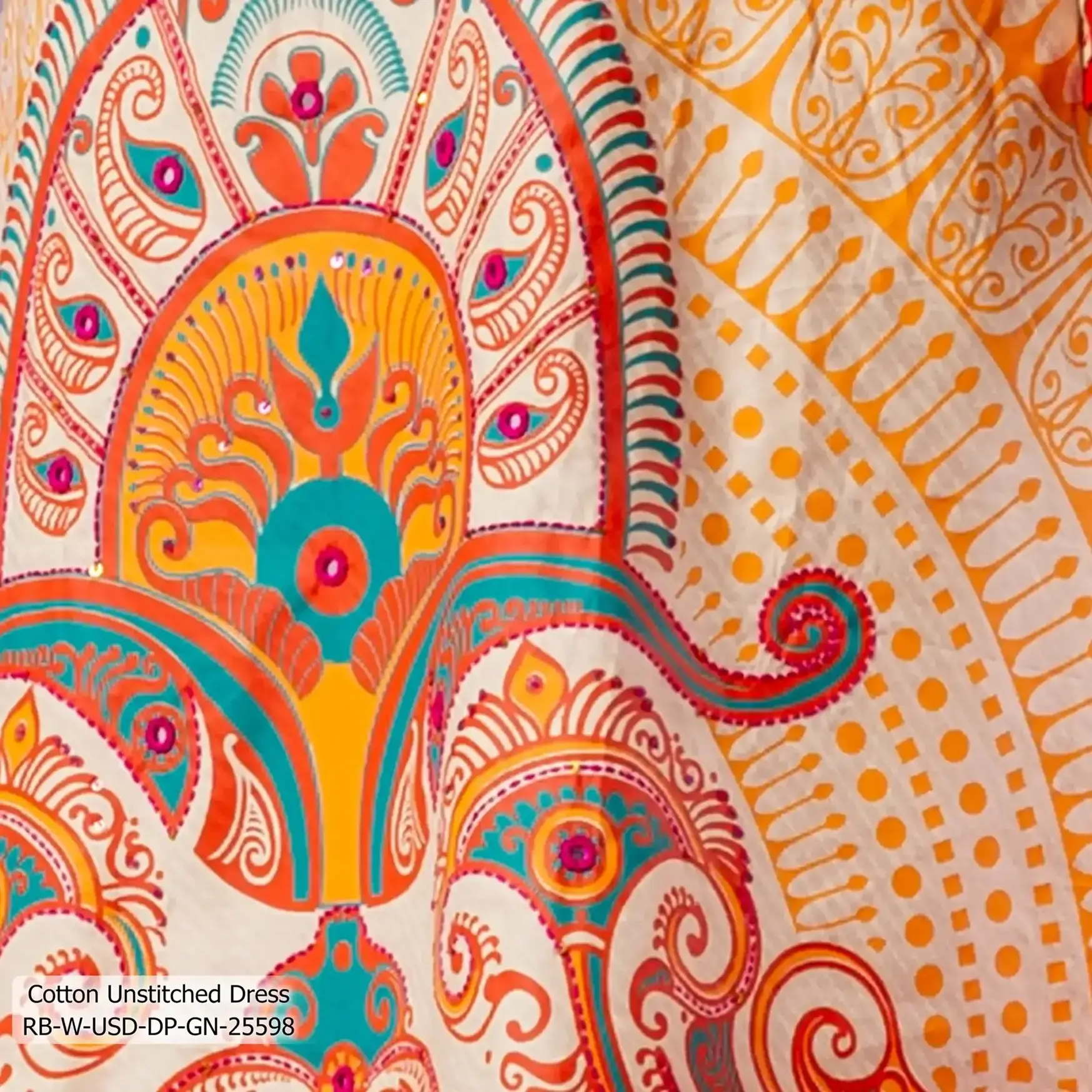 • Product Details: This cotton women’s unstitched dress features Screen-print  Patch-Work & Hand-work.
